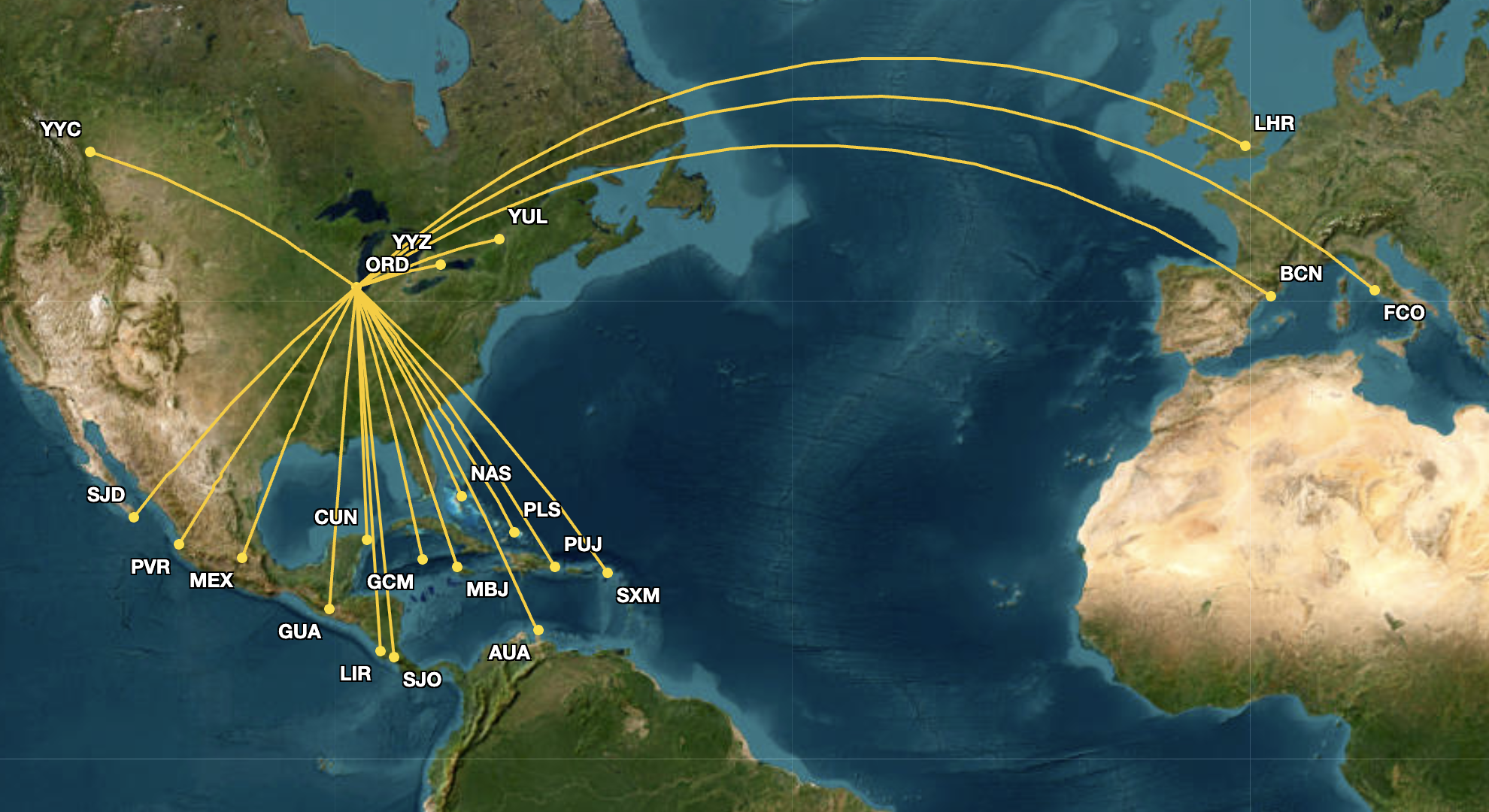 American Airlines added six international routes from ORD that will overlap with United Airlines’ network during the month, which are displayed below.