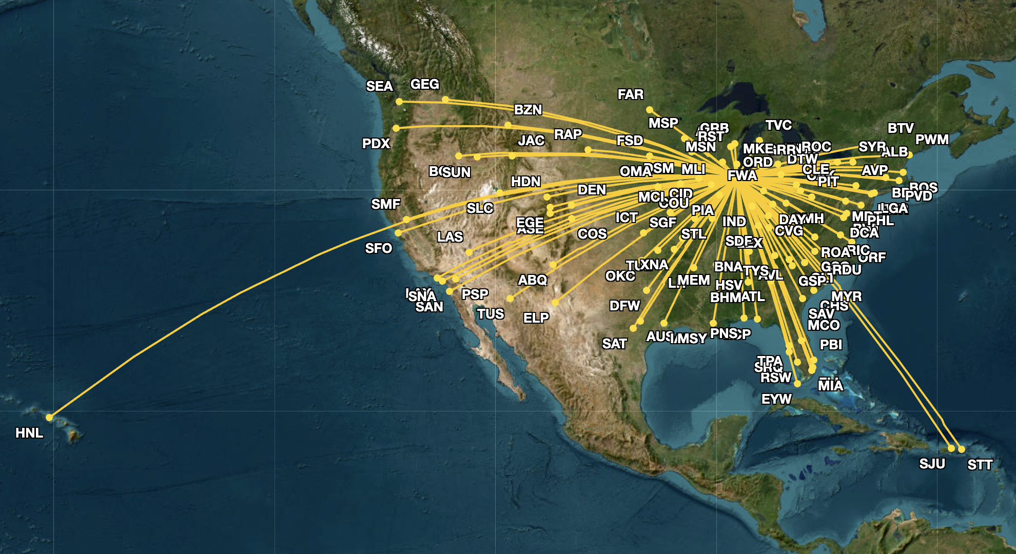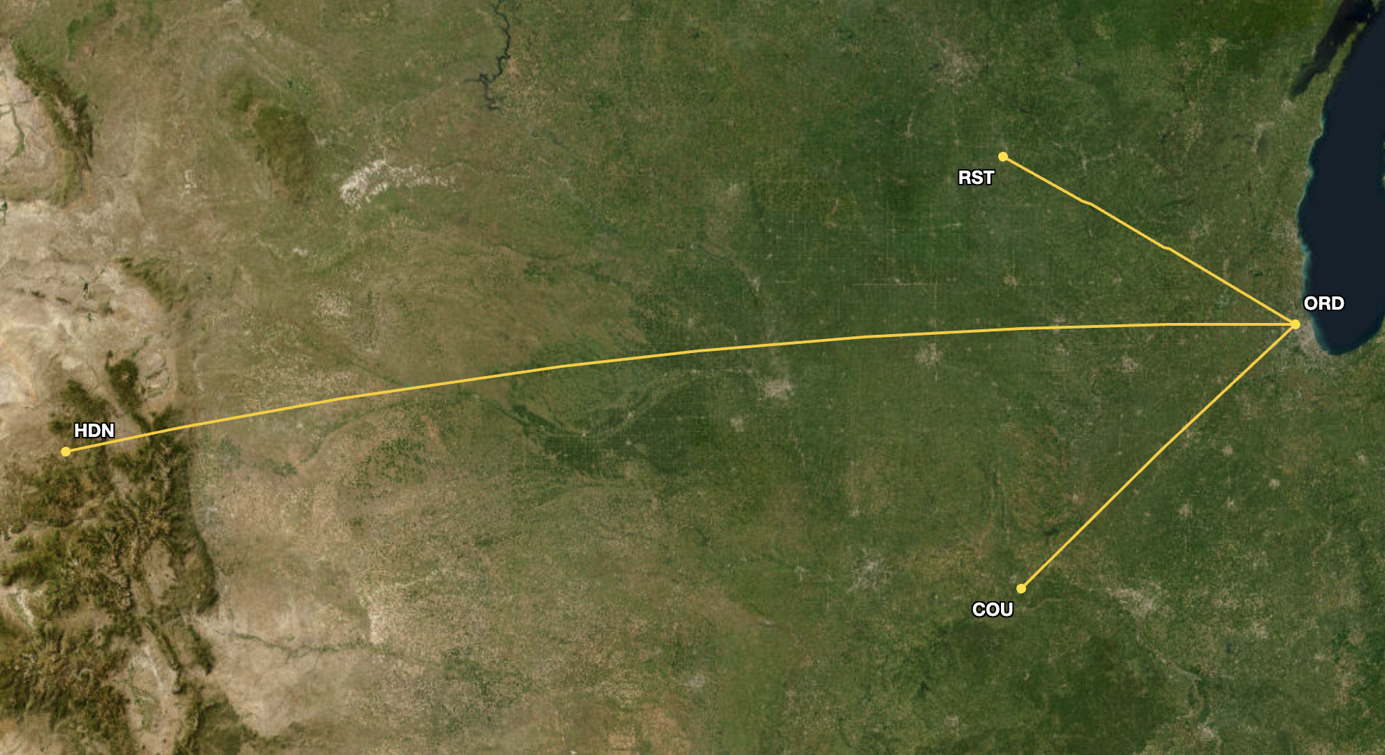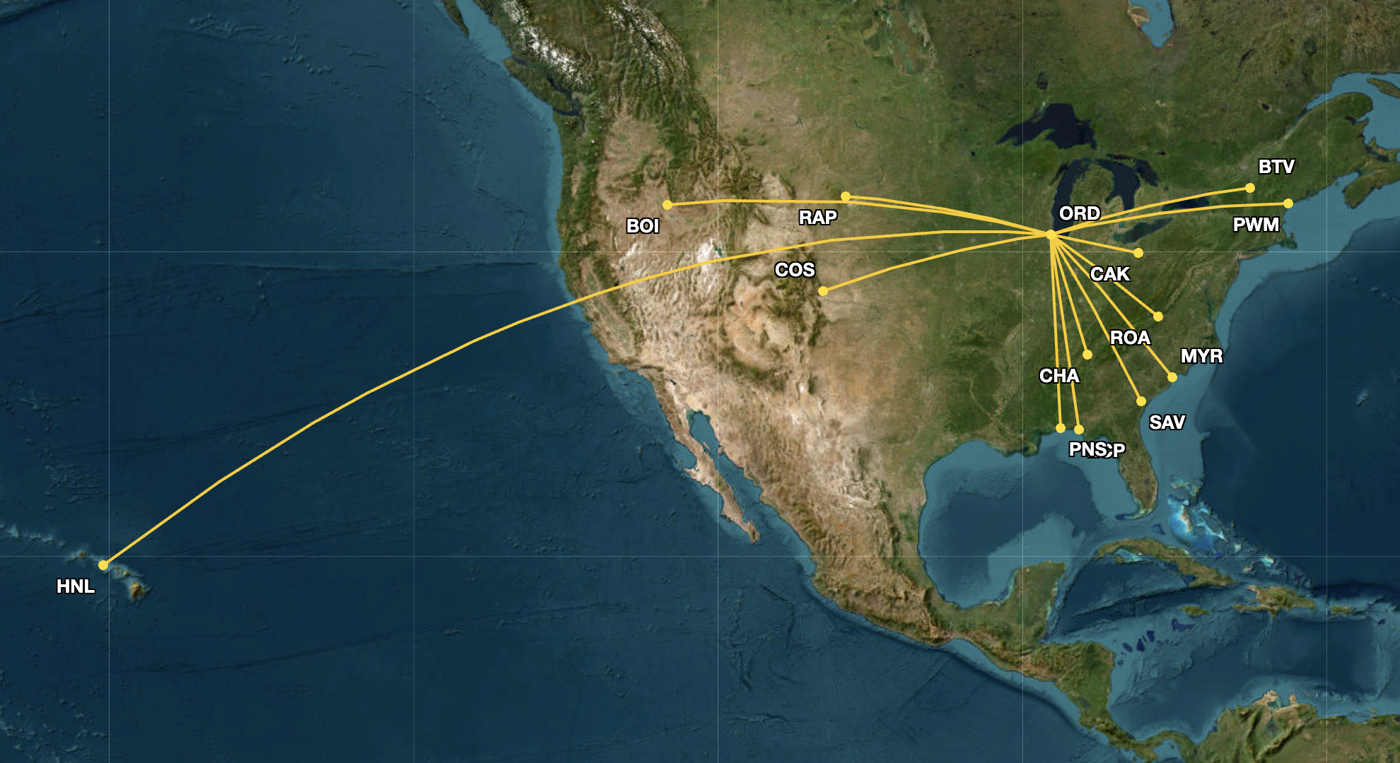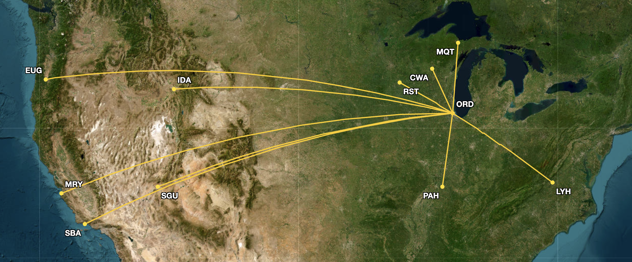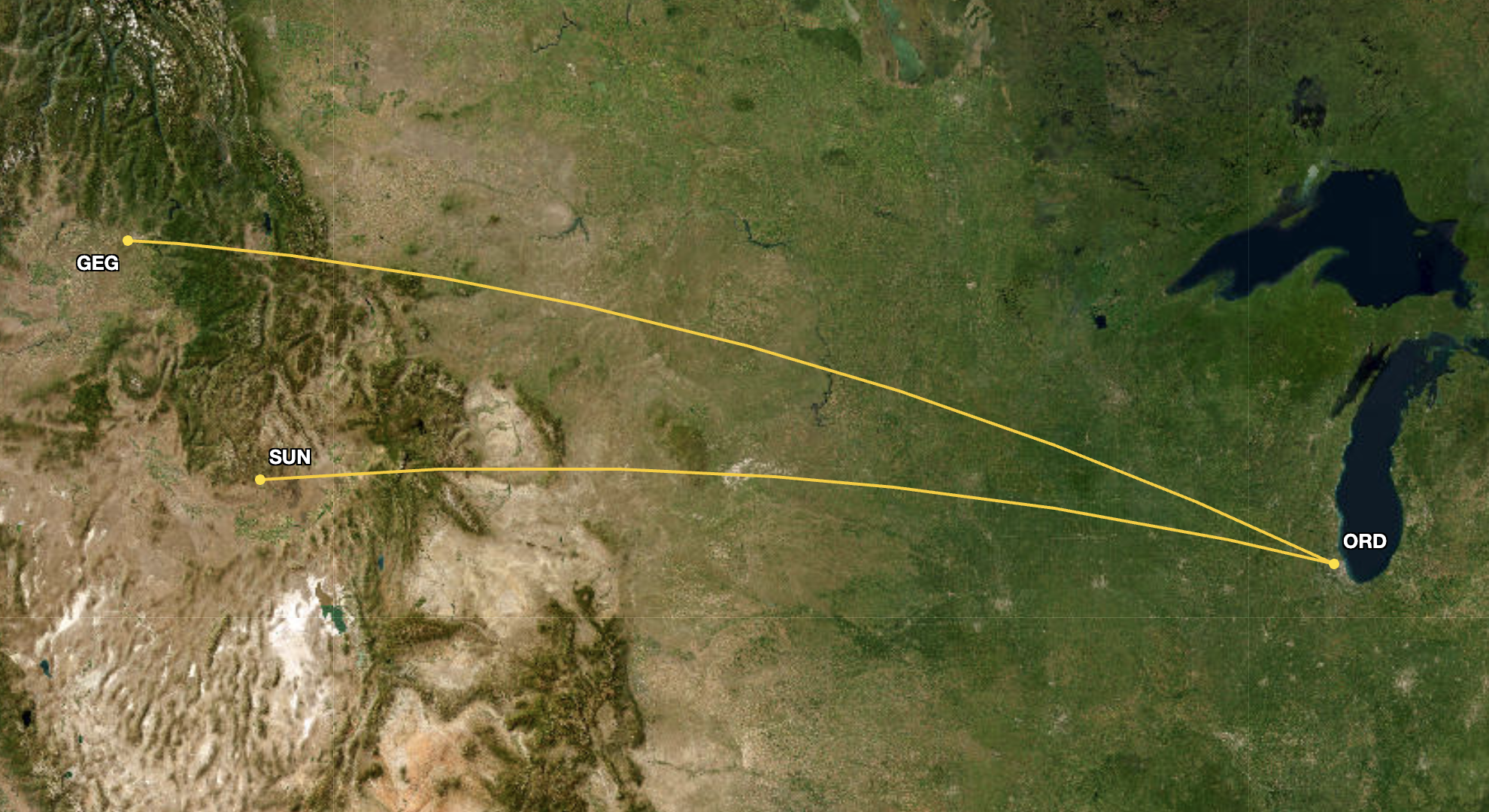 Both carriers also added the same two overlapping routes from ORD to Spokane International Airport (GEG) and Friedman Memorial Airport (SUN), displayed below.