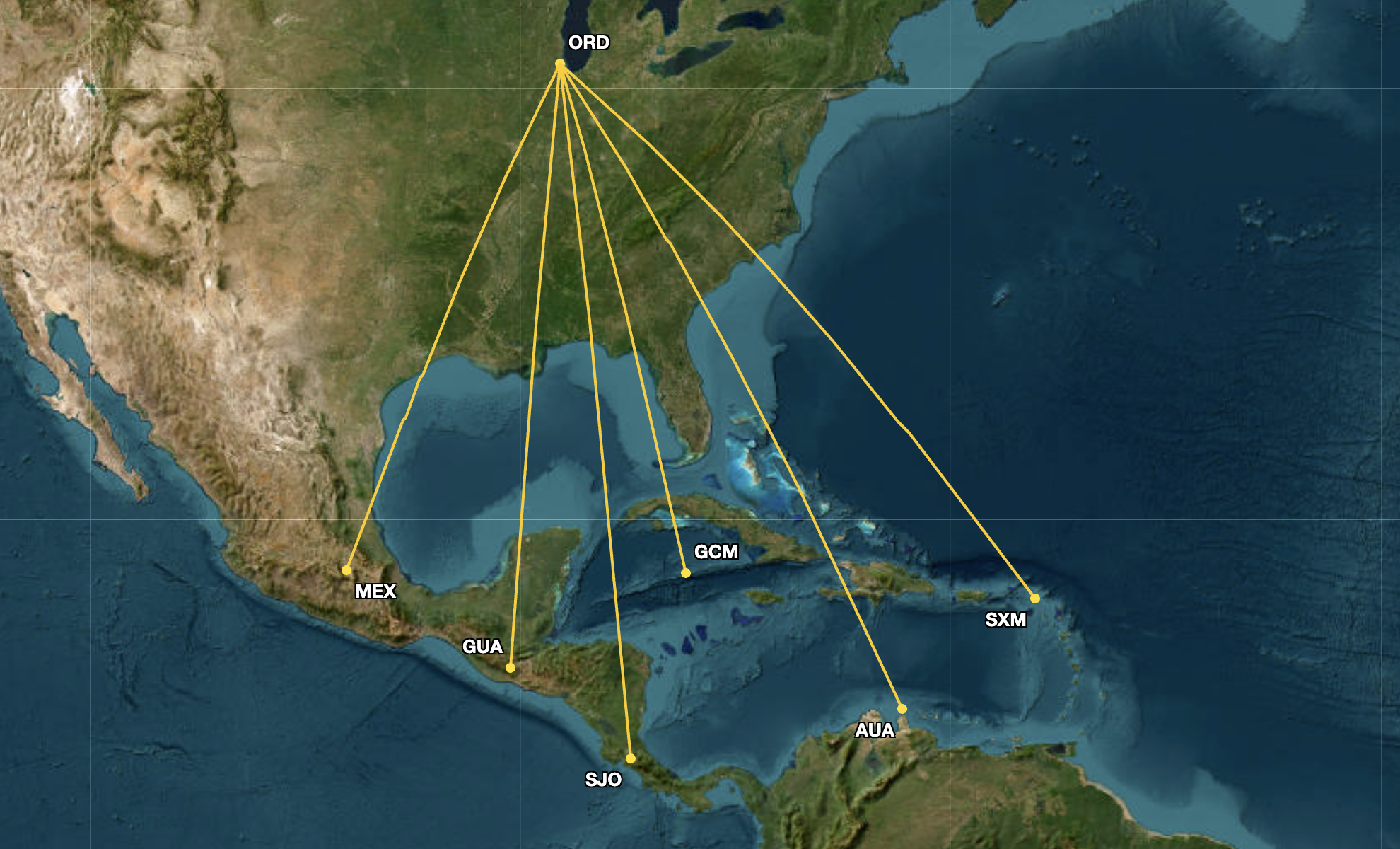 The overlapping routes and the two airlines’ routes – American Airlines and United Airlines, respectively – that were not scheduled in April 2025 are displayed below.