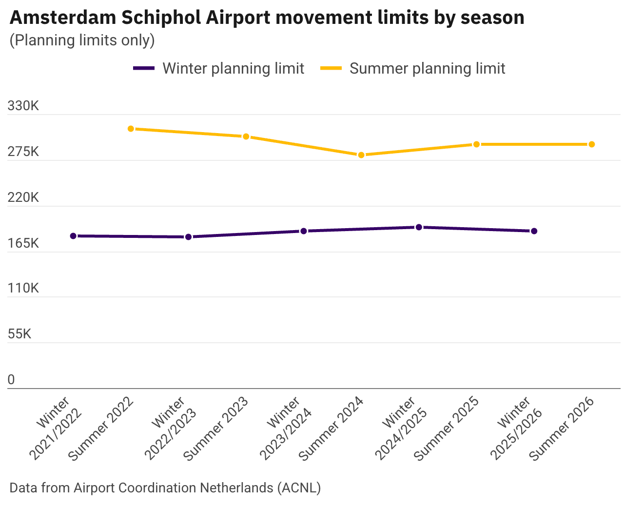 Throughout that time, the number of maximum planned flight movements at AMS varied by season. During the summer 2022 season, the cap was over 311,000; by the summer 2026 season, it had been reduced to over 293,000, according to seasonal reports by Airport Coordination Netherlands (ACNL), which coordinates slots at three Dutch airports.