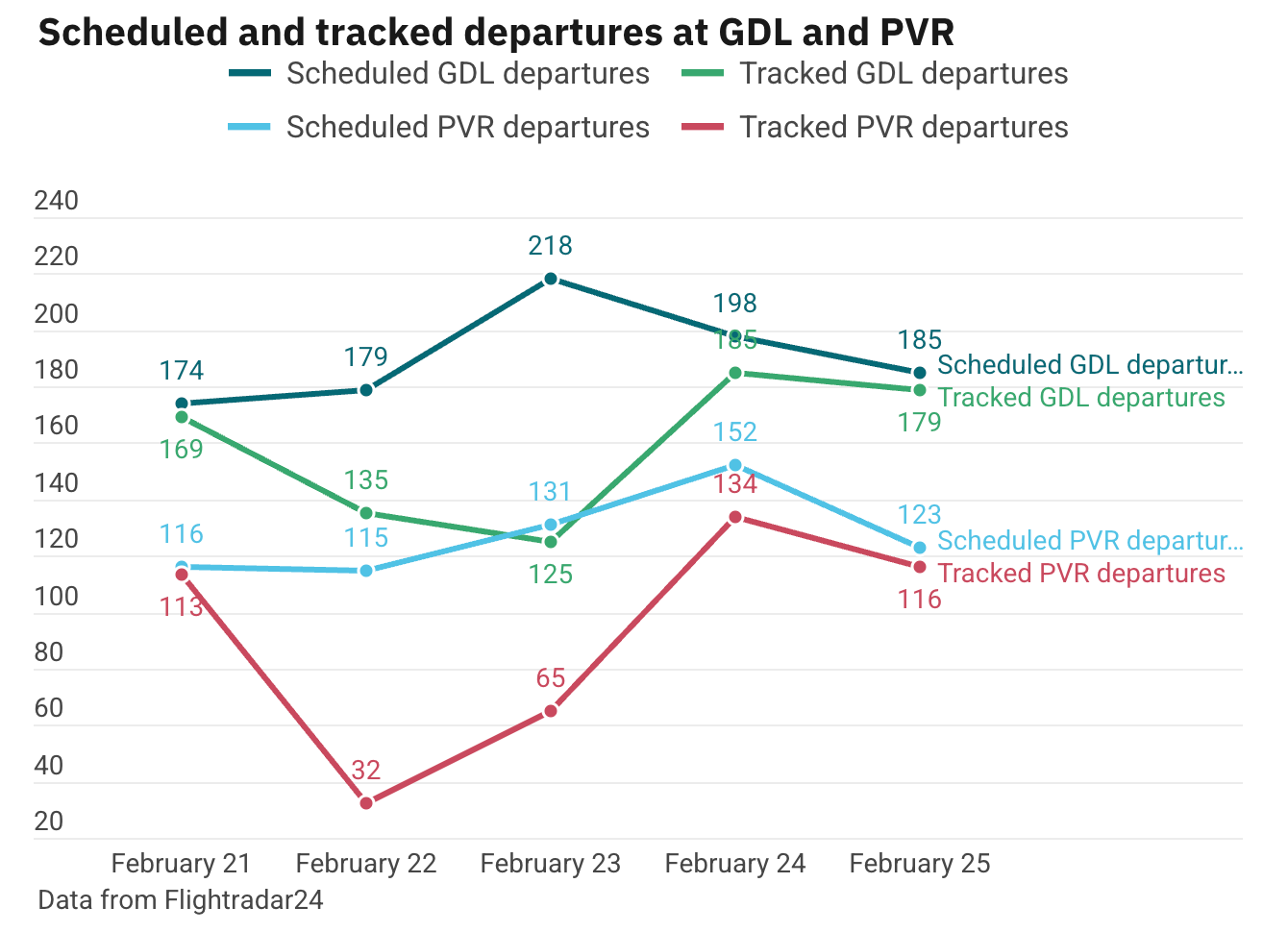 By comparison, on February 22 and 23, the gap between tracked and scheduled departures at GDL was 44 and 93, respectively. At PVR, the gap was 83 and 66 during those two days.