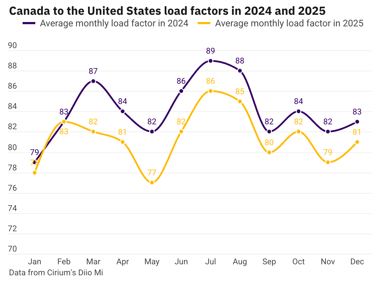 Full-year data for 2025 shows that capacity, measured in available seat kilometers (ASKs), and load factors from Canada to the United States have dropped as geopolitical tensions have resulted in Canadians choosing other options for their travels.