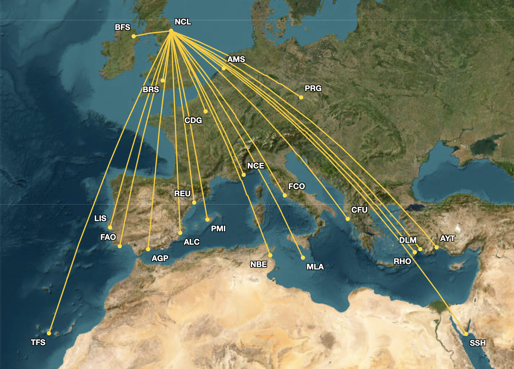 With the addition of four additional weekly flights from NCL to FCO and LIS, its August 2026 schedule will now include 80 weekly departures, with all of easyJet’s NCL routes from NCL being displayed in the map below.