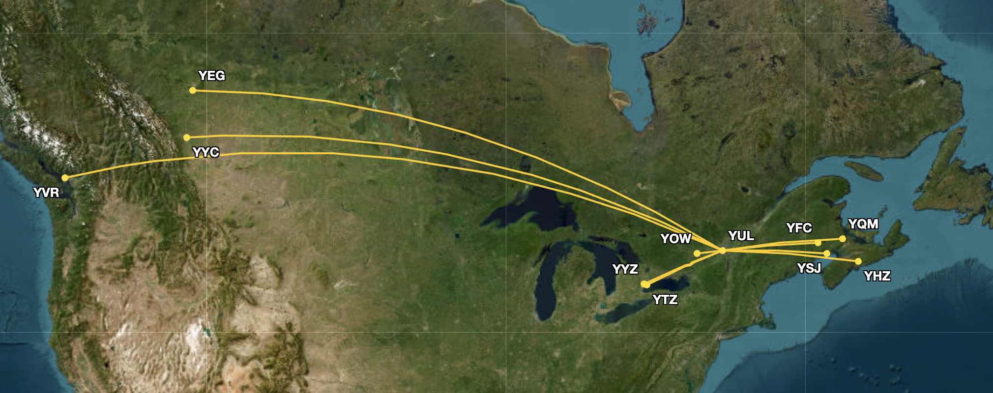 Emirates currently flies the 777-200LR, at times, the 777-300ER, between DXB and YUL. Flight EK 243 is scheduled to depart DXB toward YUL at 02:45 local time (UTC +4) and land in the Canadian city at 07:35 local time (UTC -5).
