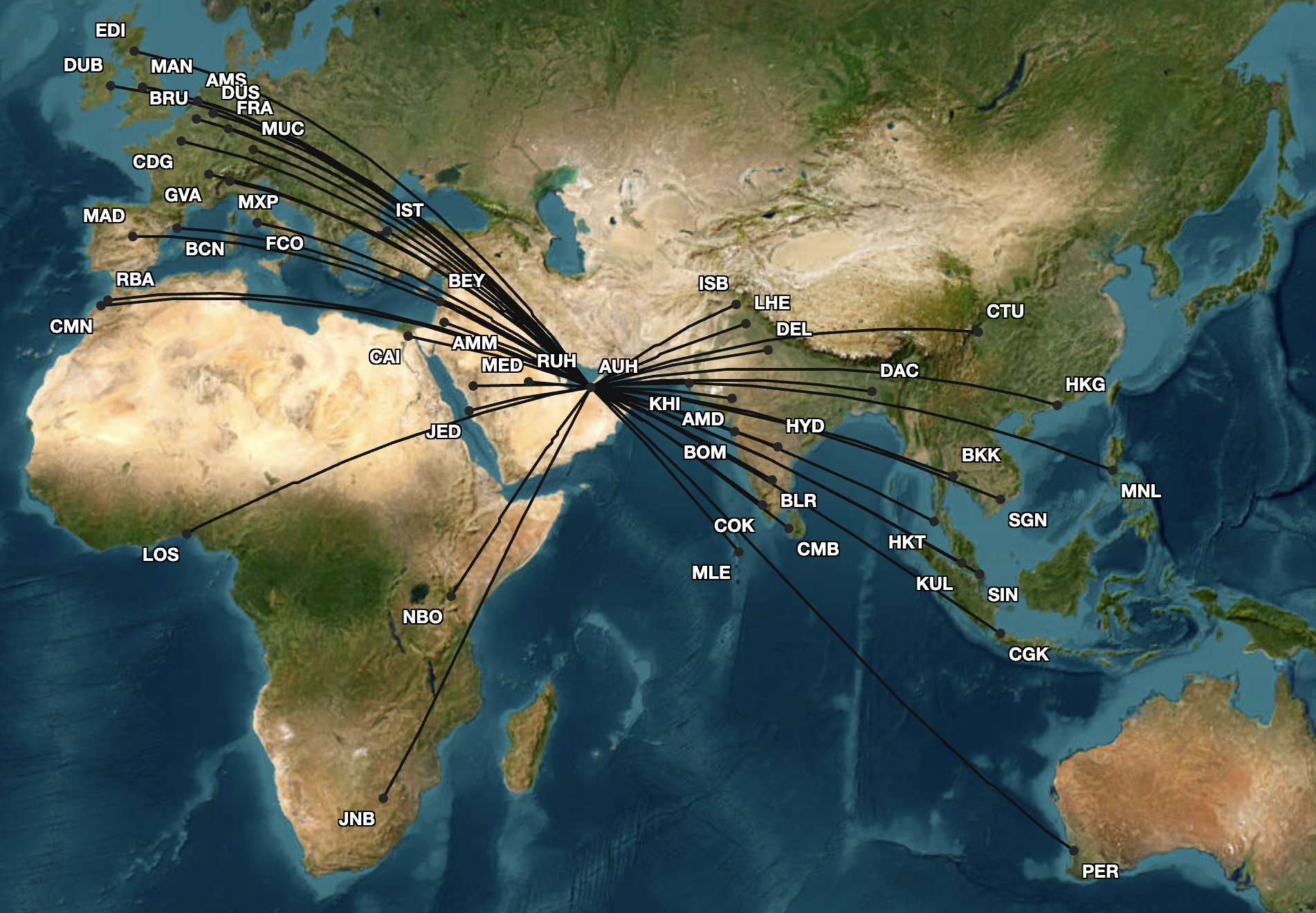 Cirium’s Diio Mi showed that in 2019, the carrier’s A330s flew to a total of 48 destinations from AUH. Some airports saw Etihad Airways’ A330 aircraft a handful of times during the year, such as Madrid Barajas Airport (MAD) or Amman Queen Alia International Airport (AMM).