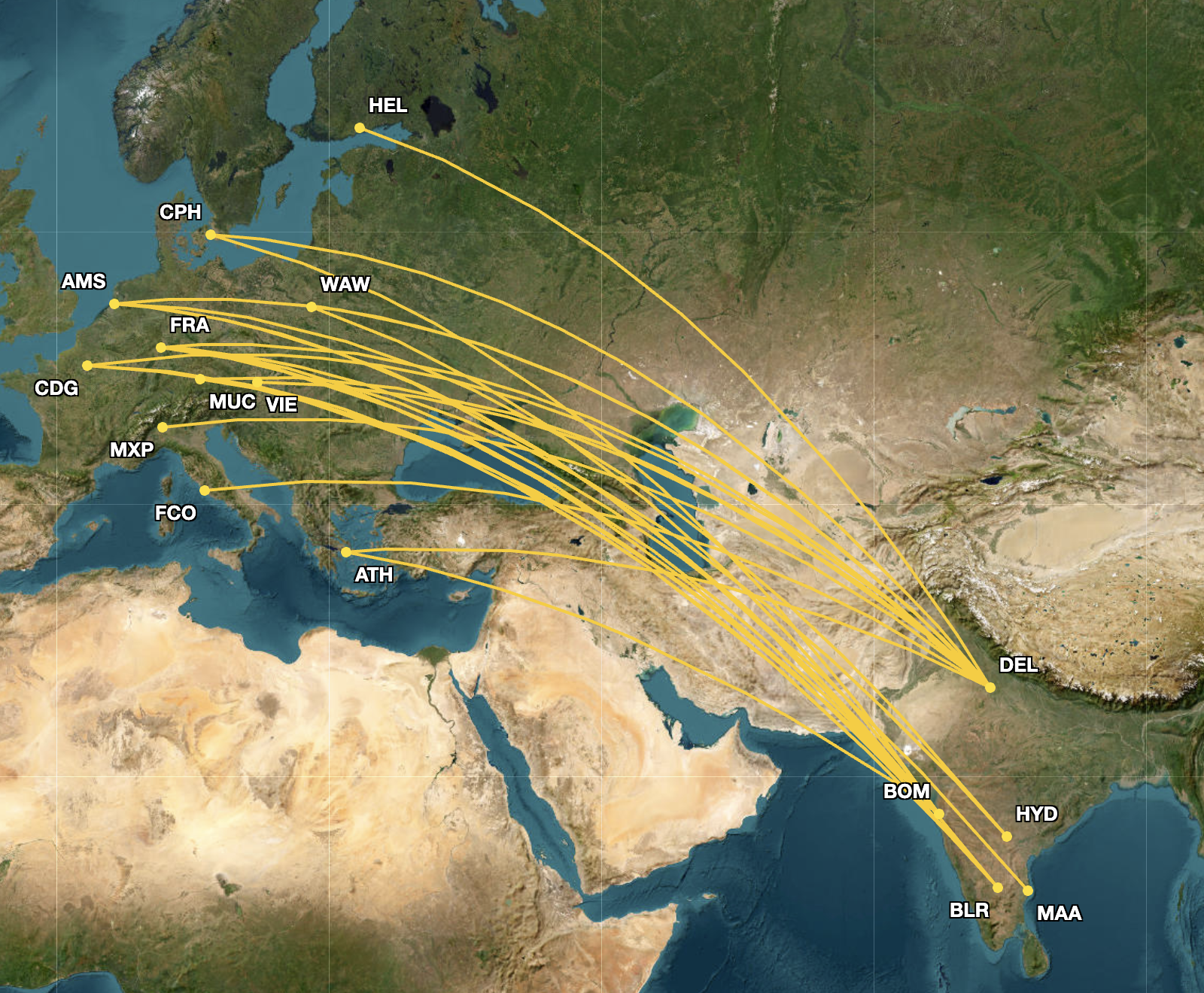 The currently scheduled EU-India air network in 2026 is displayed below.