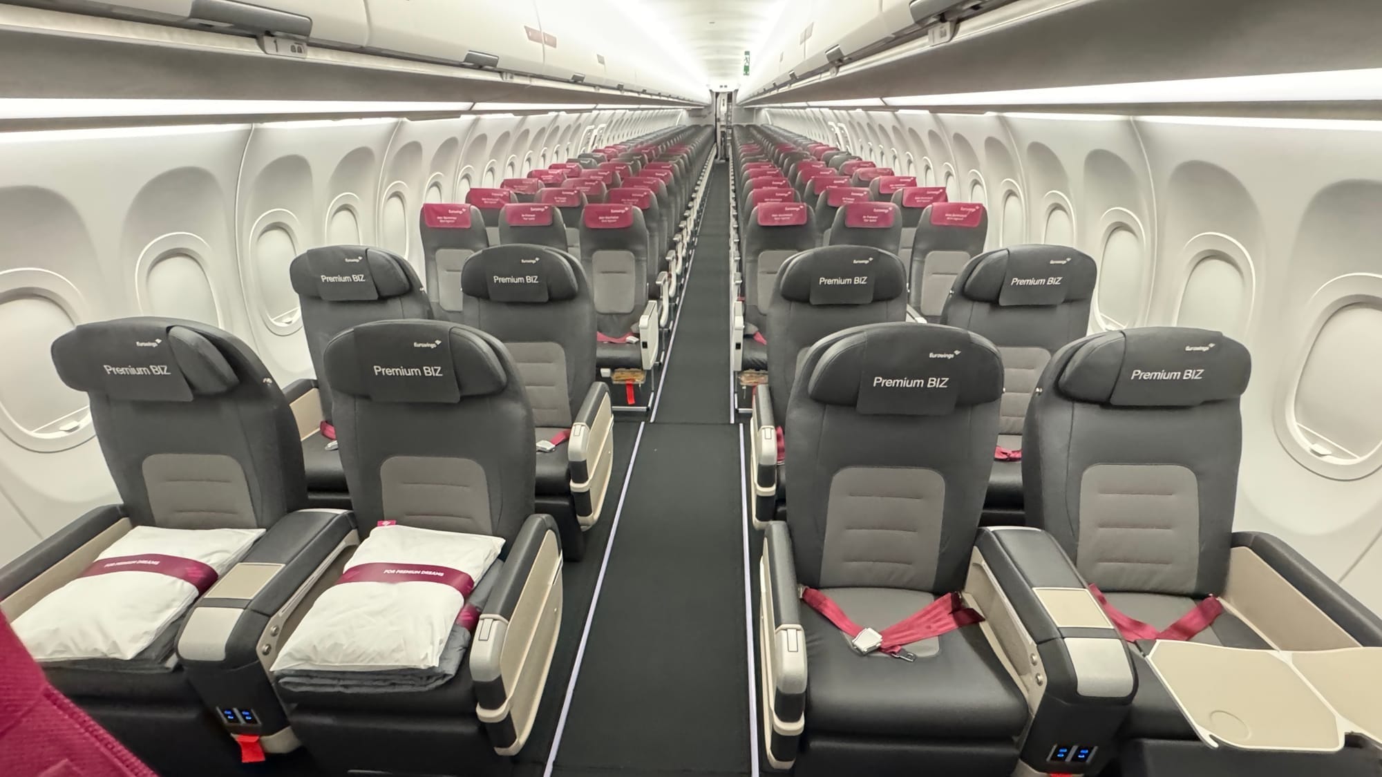 Instead of the usual European business class, which includes three seats on reach row with the middle seat blocked off, Premium BIZ has four seats per row, split between two seats on each side of the aircraft.