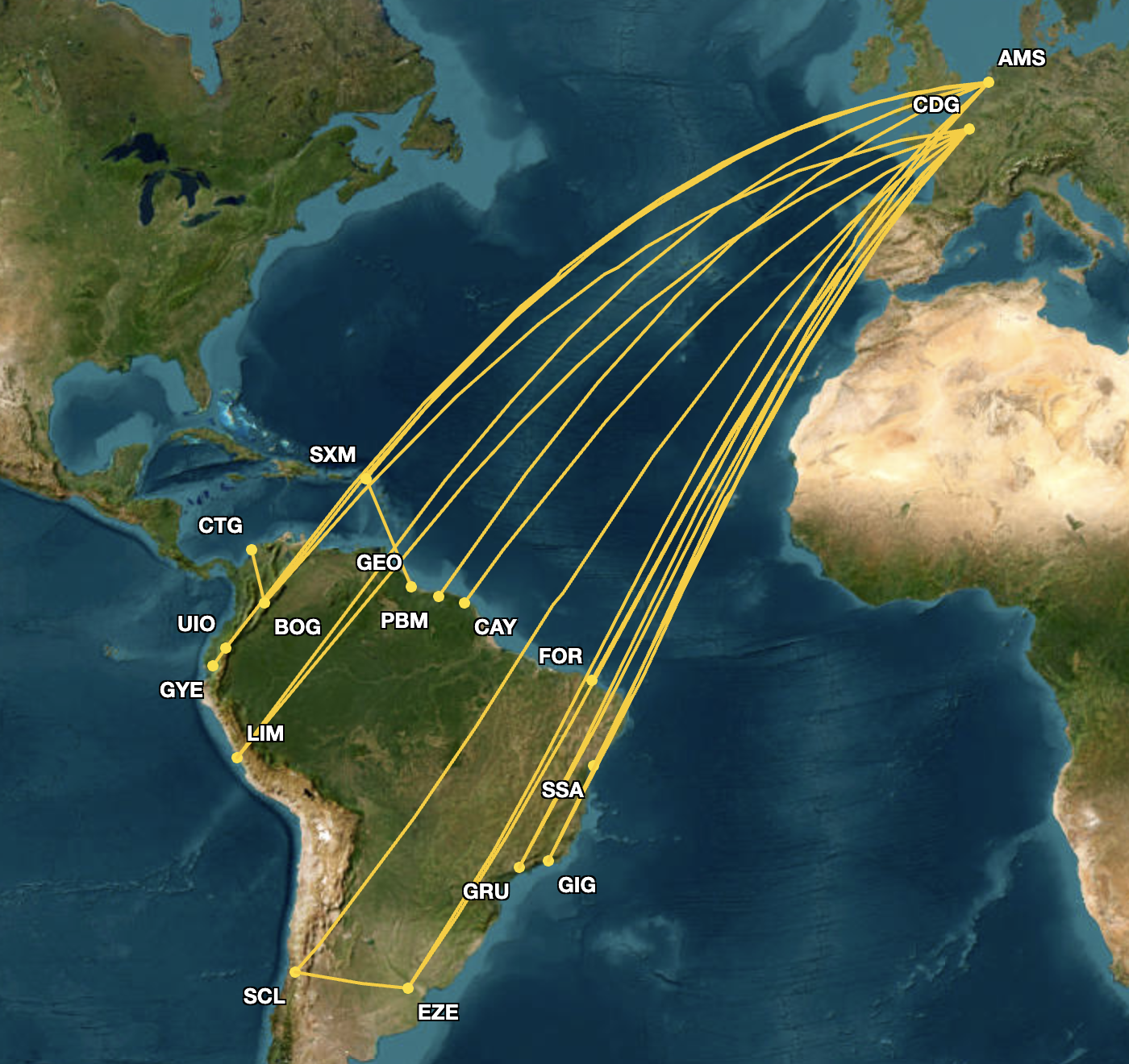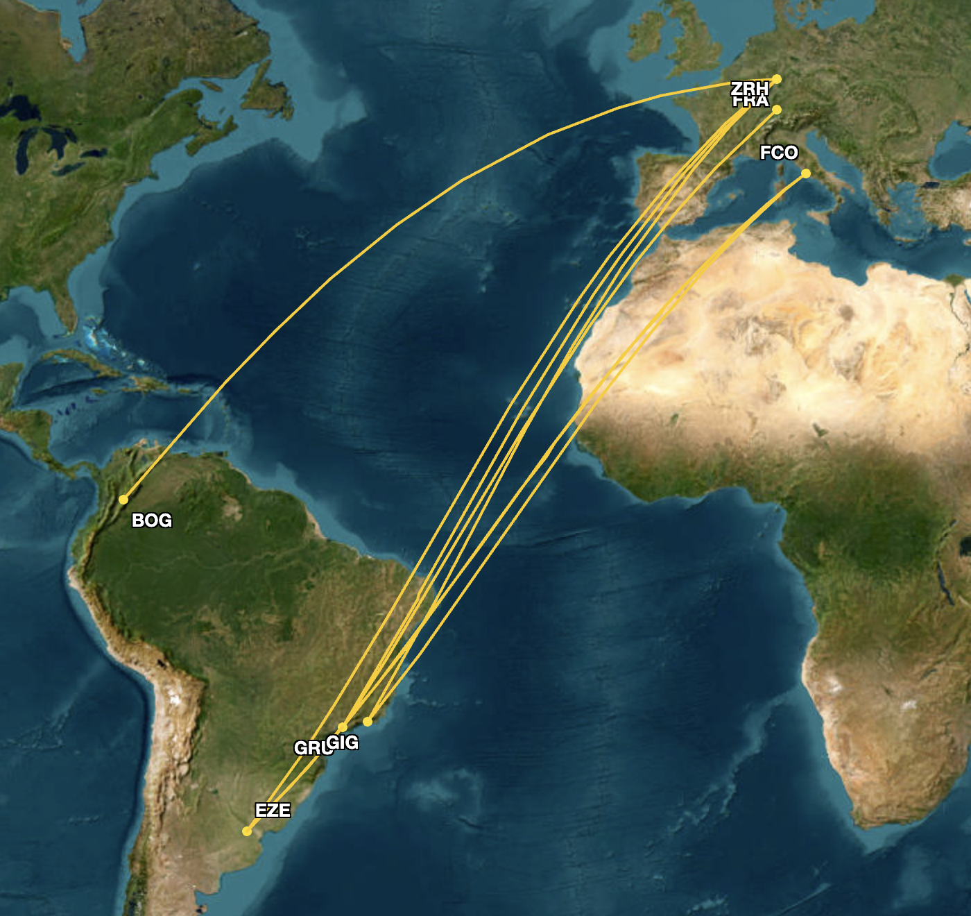 In comparison, Air France-KLM had 132 weekly departures during the same month, IAG had 144, and Lufthansa Group had only 60, which includes ITA Airways’ routes. Their networks are displayed below. (Air France-KLM, IAG, and Lufthansa Group, respectively.)