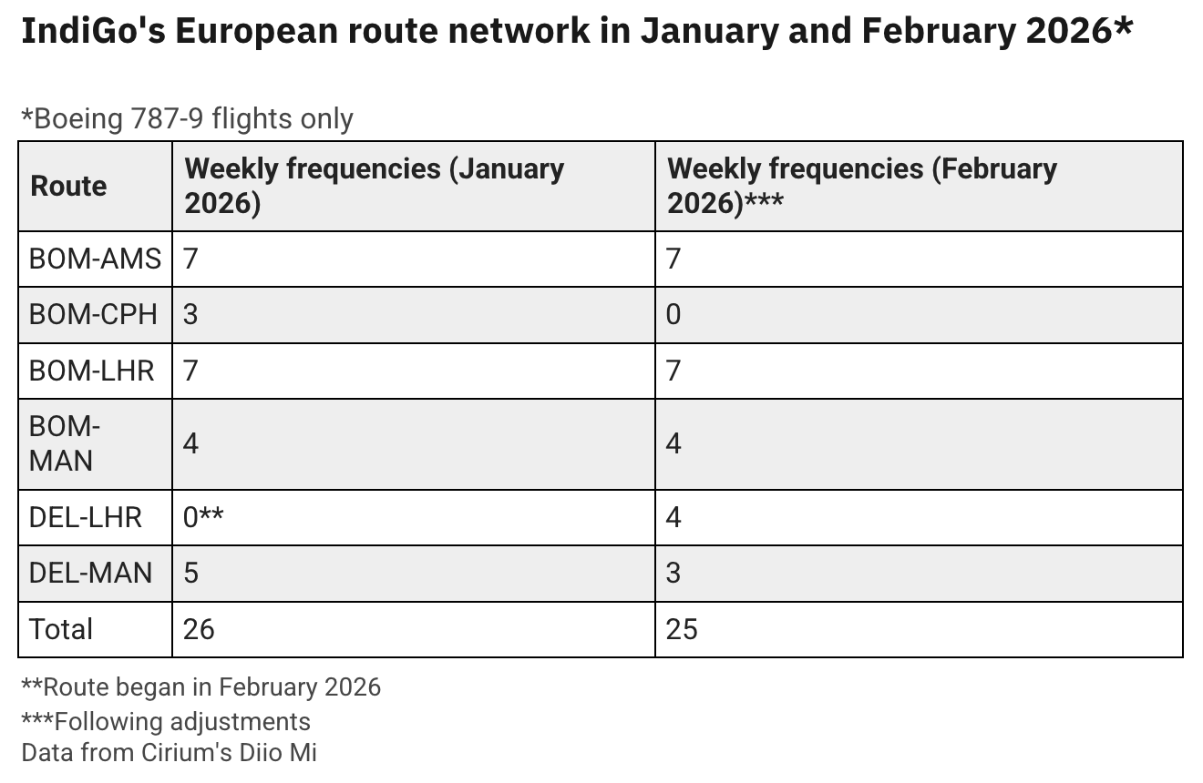 IndiGo will also adjust the number of weekly flights from Delhi Indira Gandhi International Airport (DEL) to Manchester Airport (MAN), first going from five to four weekly, then to thrice-weekly from February 19.