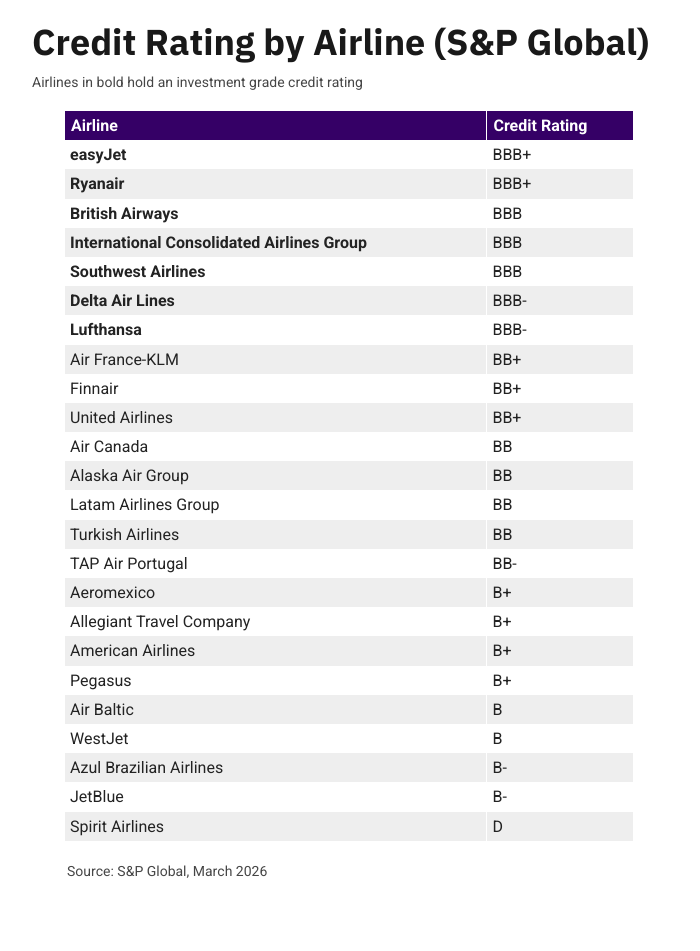 Nevertheless, an investment-grade rating remains the holy grail. Just seven airlines hold an investment-grade credit rating with S&P Global, the largest of the three rating agencies.
