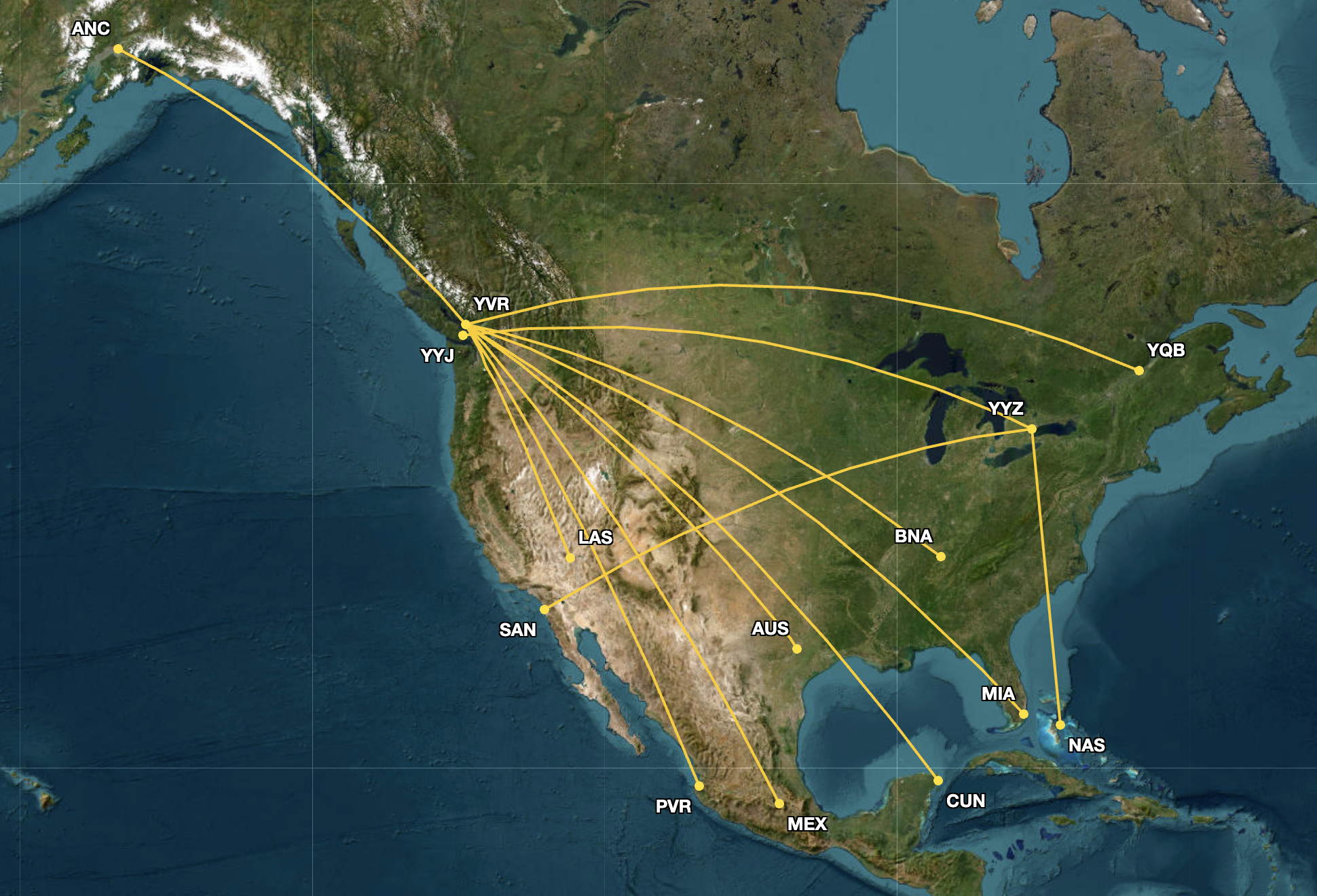 At YVR, the 737 MAX 8s’ route map will include nine destinations, which are displayed below.