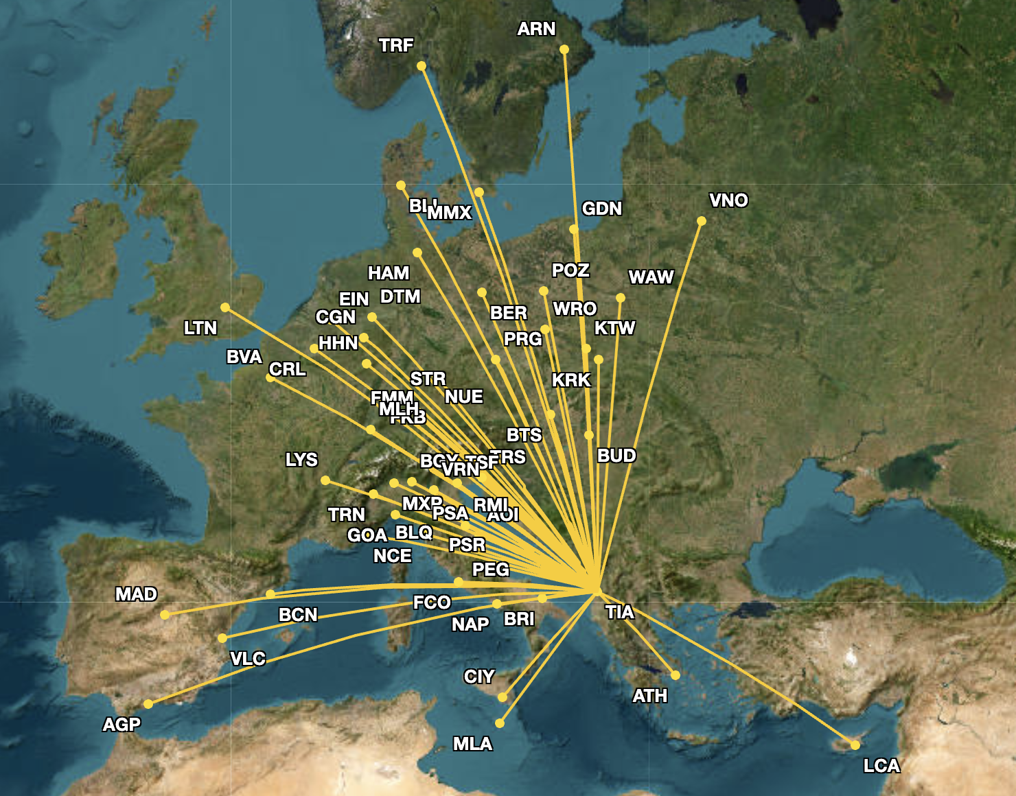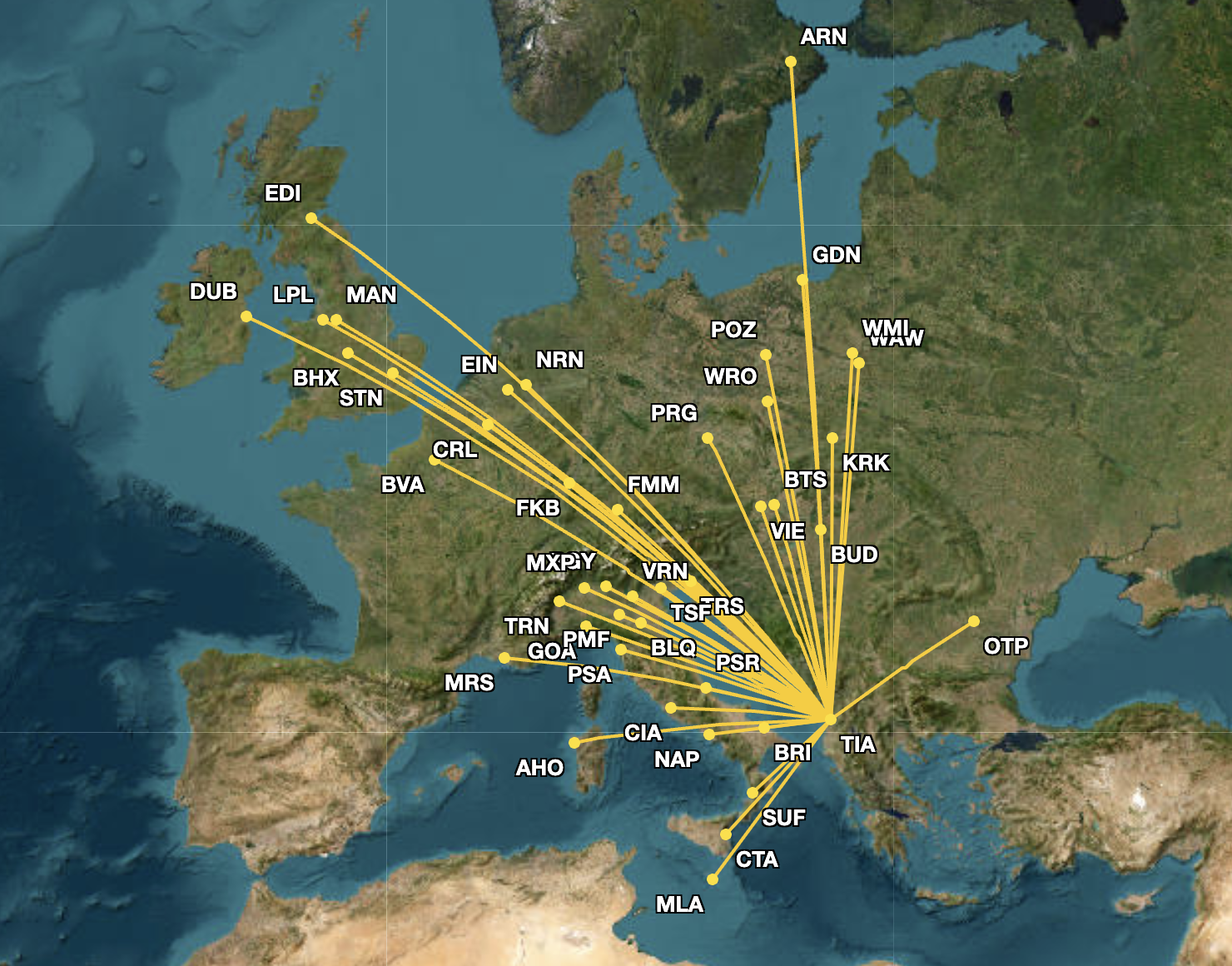 Ryanair’s July route network from TIA is displayed below.