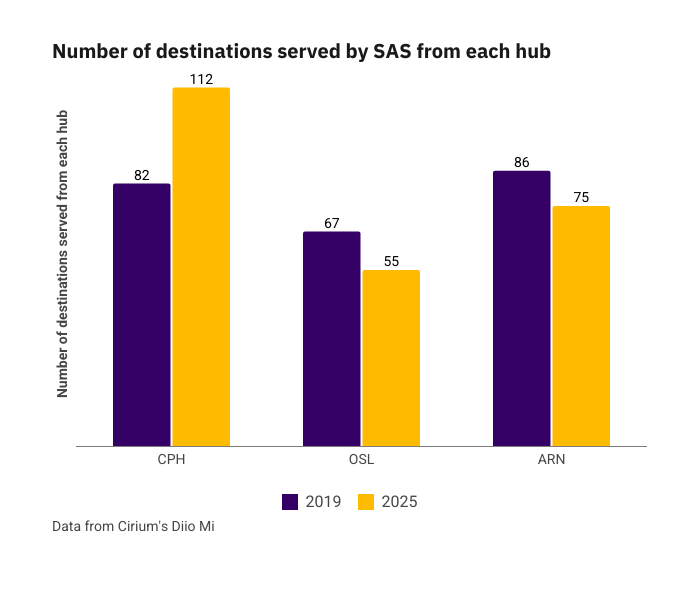Compared to 2019, CPH’s European destination count rose from 82 to 112, while OSL's and ARN’s fell to 55 and 75, respectively.