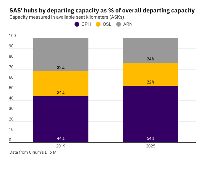 In 2025, the situation has changed. CPH has grown to 54% of SAS' capacity while OSL and ARN have fallen to 22% and 24%, respectively.