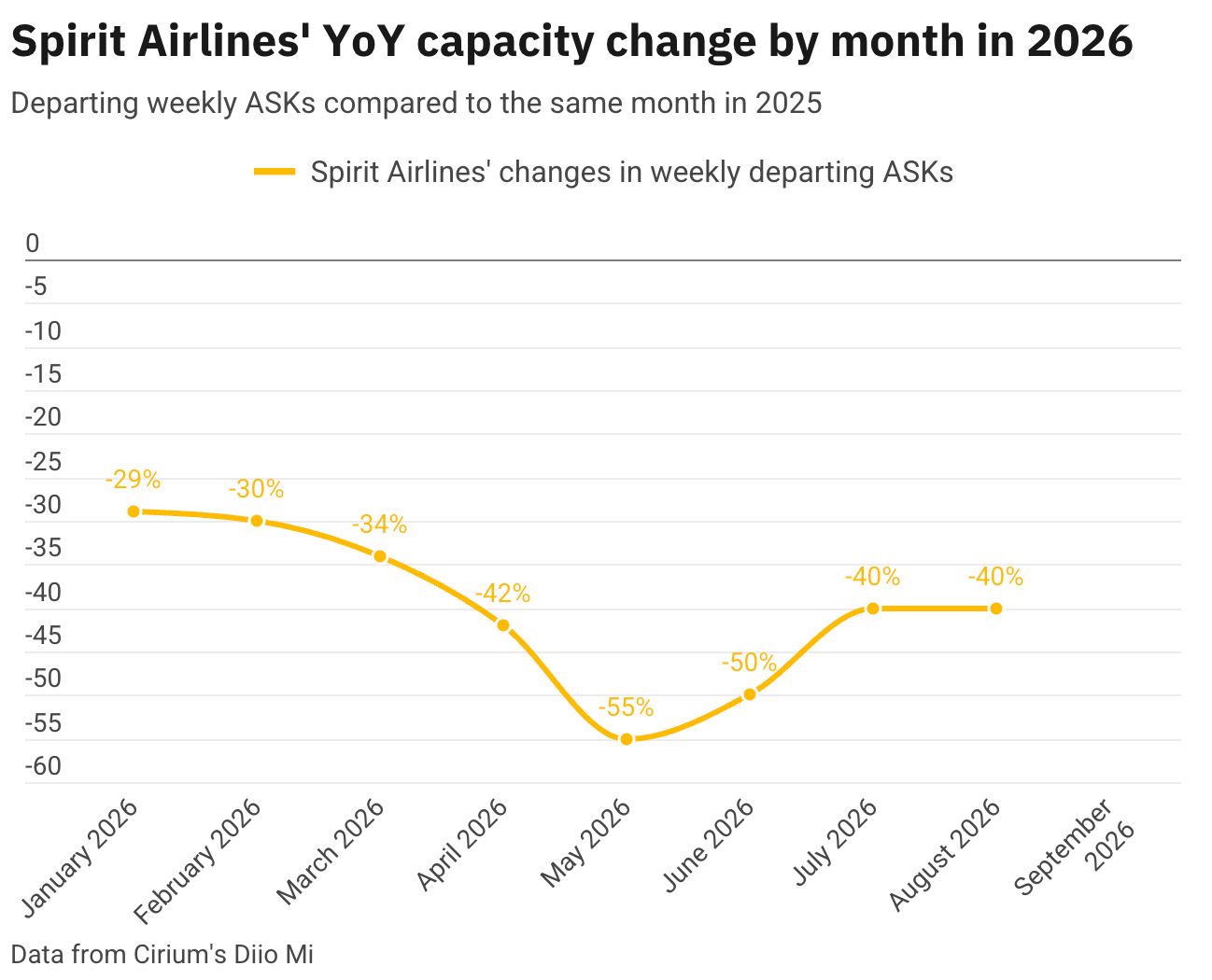As a result of the cuts, Spirit Airlines’ weekly capacity, measured in available seat kilometers (ASKs), will be 55% lower in May 2026 than the same month last year. This compares to year-on-year (YoY) cuts of 34% in March and 42% in April.
