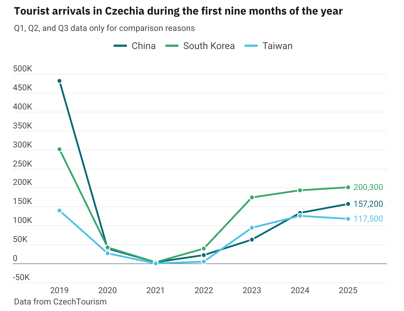 Lower capacity between East Asia and the city has resulted in a drop in the number of arrivals in Czechia, CzechTourism data showed. Visitor numbers from Taiwan to Czechia in the first nine months of 2025 were down 17% compared to the same period in 2019. Meanwhile, in the same period, visitors from China and South Korea were down 73% and 33%, respectively, compared to 2019.