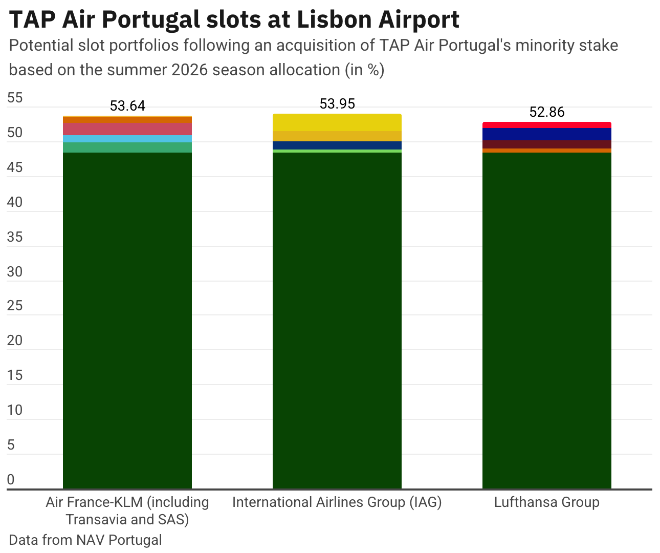 All three groups, following the acquisition of a minority stake in the airline, would hold around 53% of the total slots at LIS.