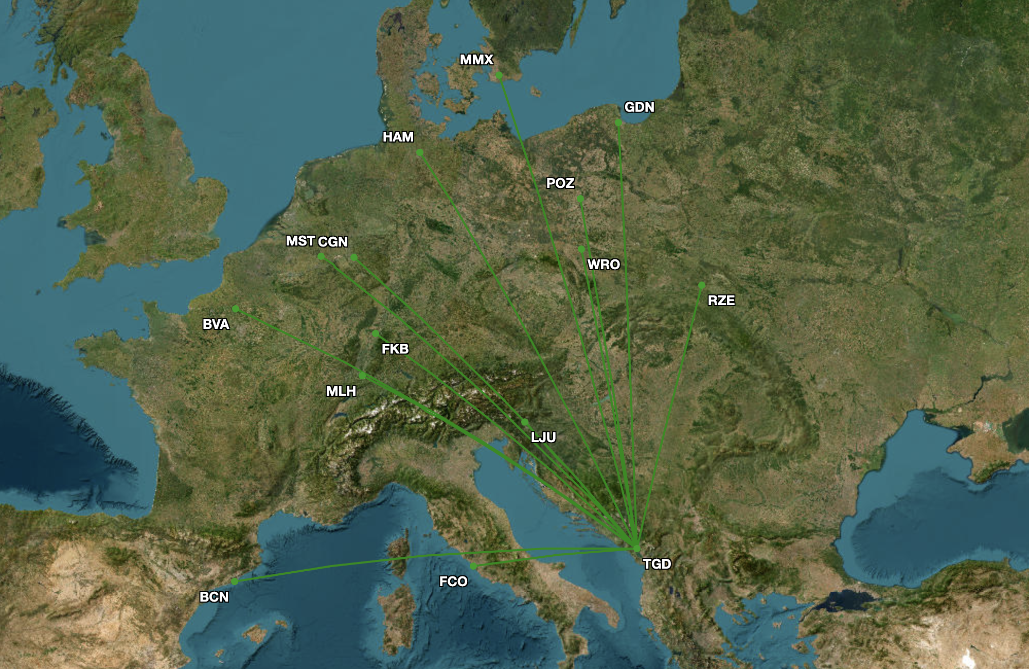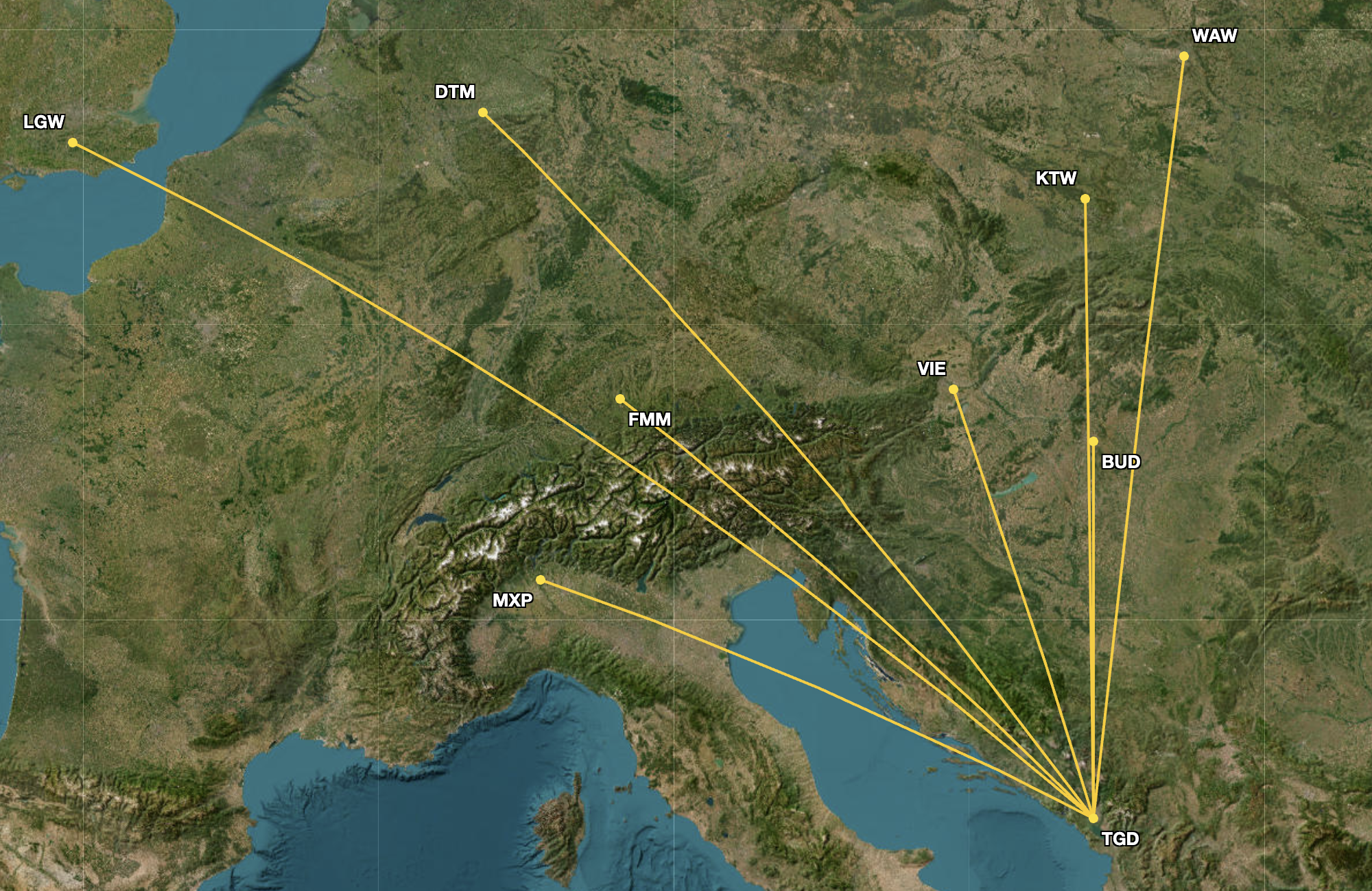 In June 2025, Wizz Air offered flights on eight routes from TGD, which are displayed below (in yellow). While Cirium’s Diio Mi showed that it should end flights from TGD and Vienna Airport (VIE), presumably due to the closure of its base at the former, the airline’s announcement includes 14 new routes that are going to begin either in March 2026 or June 2026. These are displayed below (in green).